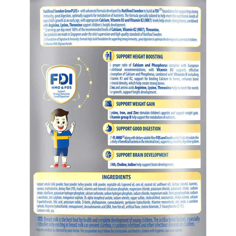 Nutifood Sweden GrowPLUS+ Sữa non là thương hiệu của Nutifood Thụy Điển với công thức được phát triển bởi Viện nghiên cứu dinh dưỡng Nutifood Thụy Điển (NNRIS), xây dựng nền tảng FDI (1) hỗ trợ Đề kháng khỏe, tiêu hóa tốt, giúp chuyển hóa tốt các dưỡng chất. Nay bổ sung Sữa non 24h tự nhiên từ Mỹ (2) với hàm lượng cao kháng thể IgG 1000 mg cùng 2′-FL HMO (3) giúp tăng cường đề kháng, cho bé phát triển khỏe mạnh.