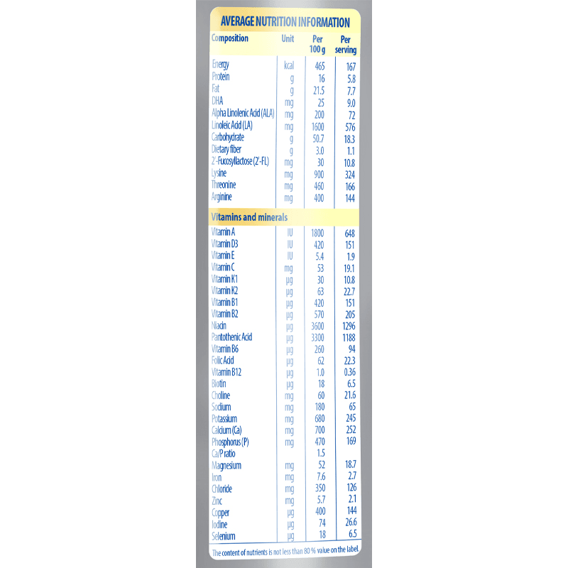 - Sữa bột chứa 2’-FL HMO cùng chất xơ hòa tan FOS và inulin, kích thích sự hoạt động của các vi khuẩn có lợi trong đường ruột, tốt cho hệ tiêu hóa.